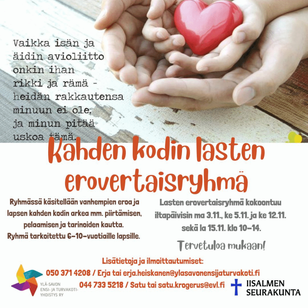Ryhmässä käsitellään vanhempien eroa ja lapsen kahden kodin arkea mm. piirtämisen, pelaamisen ja tarinoiden kautta. Ryhmä tarkoitettu 6-10v. lapsille.