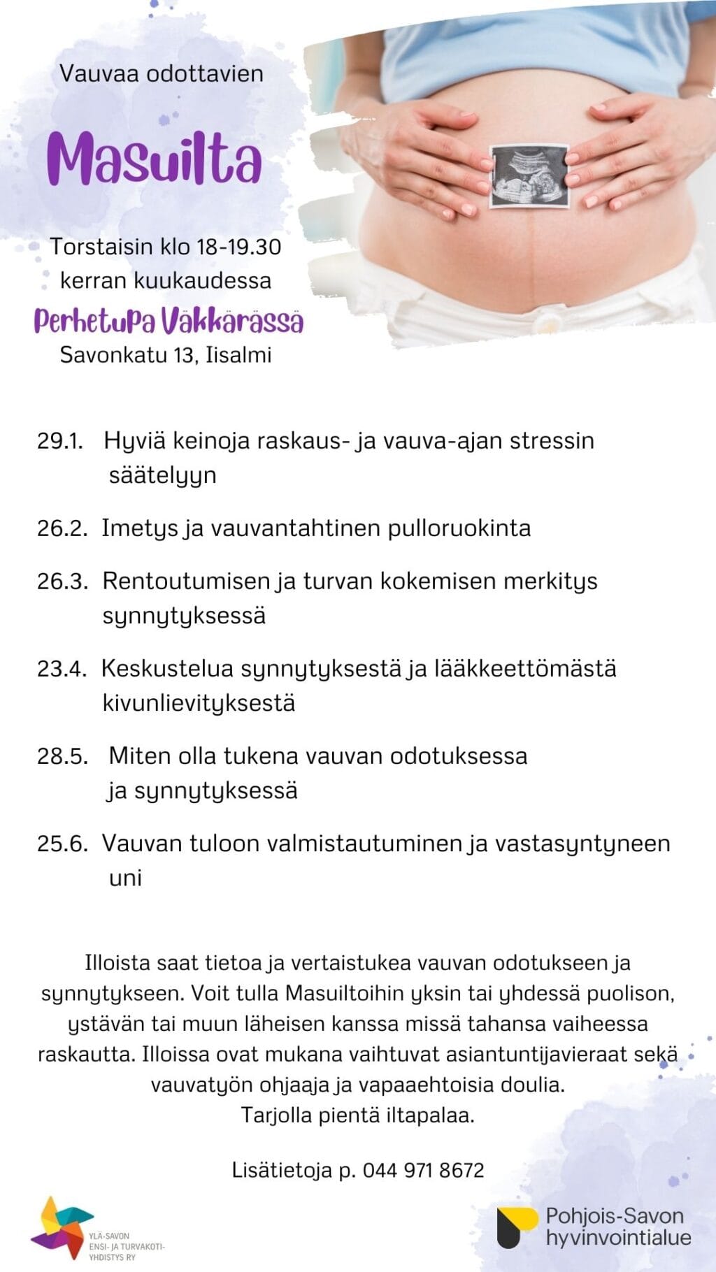 Kerran kuukaudessa järjestettävissä Masuilloissa saat tietoa ja tukea vauvan odotukseen ja synnytykseen. Illoissa on mukana hyvinvointialueen asiantuntijoita, vauvatyön ohjaaja sekä vapaaehtoisia doulia. Jokaisessa illassa on oma teemansa.