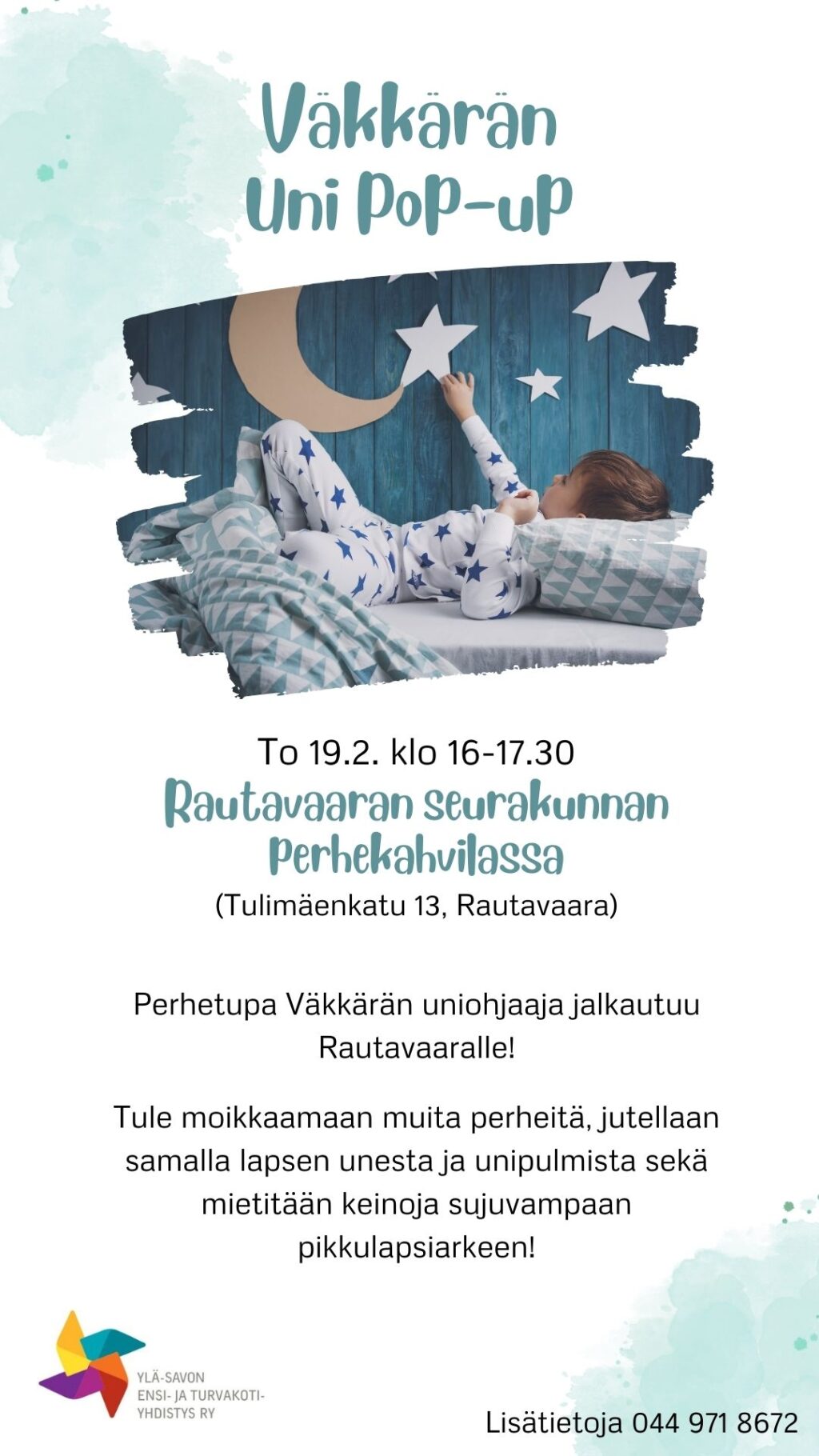 Väkkärän uniohjaaja jalkautuu Rautavaaralle! Tule moikkaamaan muita perheitä, jutellaan samalla lapsen unesta ja unipulmista sekä mietitään keinoja sujuvampaan pikkulapsiarkeen.