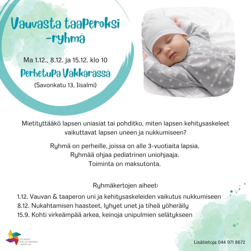 Mietityttääkö vauvan uniasiat, kehitykseen liittyvät hulinavaiheet tai haluaisitko saada ohjausta vauvan unipulmiin? Vauvasta taaperoksi -ryhmässä saat uniohjaajalta tietoa ja ohjausta näissä kysymyksissä. Perheet pääsevät myös jakamaan omia kokemuksiaan ja hyviksi kokemiaan keinoja arjen pulmatilanteissa.